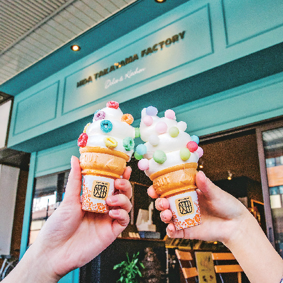 かわいい♪ソフトクリーム。レインボーソフト(左)、おいりソフト(右、各500円) HIDA TAKAYAMA FACTORY Dolce&Kitchen