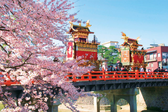 高山祭は全国からの観光客でにぎわうイベント。春の山王祭では、華麗な屋台と赤い中橋を撮影したい。桜が満開なら最高!