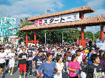 米軍基地の中や勝連城跡を横目に走る日本陸連公認コースで開催。フルマラソンと10㎞のコースがある。