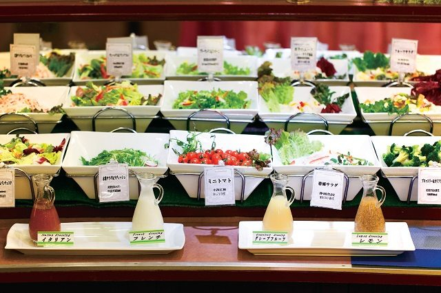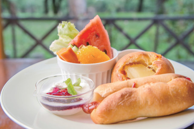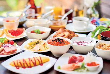 ホテルの朝食バイキングが定番。8~12時にのみ提供されるピーベリーのねぼうセットも人気。