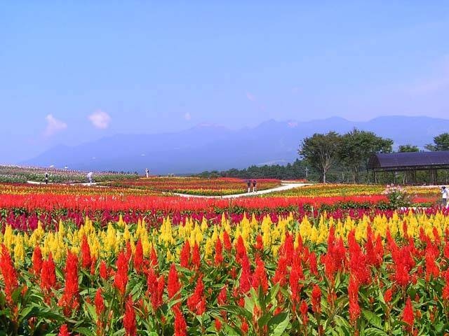 那須連山を背景に、春はチューリップやポピー、夏はマリーゴールドなど約20種の花が咲き誇ります。