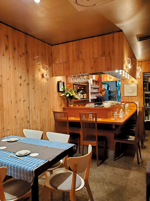 木目調のこぢんまりした店内。アルコールの注文が必須