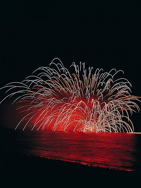 海を走る船から海中に放たれる水中花火が名物。近くで見ることができるので迫力満点! 海面に映る花火も幻想的。毎年多くの人が訪れるため、場所取りはお早めに。