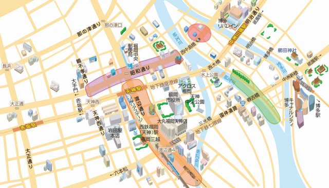 天神の中心部をつらぬくメインストリート。観光客が多く、ビギナーにおすすめ。