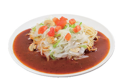 スパイシーな“あん”を太麺にからめて食べるスパゲッティ。濃いめの味でボリュームがあり、男性のファンが多い。トッピングする具のバリエーションも豊富で、選べる楽しさもある。