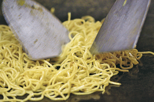 麺の片面をきつね色まで焼く。焼いてない麺に野菜のうま味がしみ込み、2倍おいしい