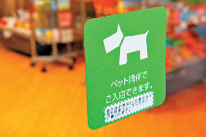 ショッピングプラザ内にはワンちゃん入店OKのショップもあります。各店舗のペットの入店情報はこのステッカーをチェックしましょう。