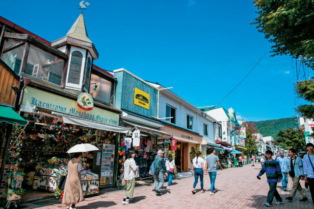 かつて中山道の軽井沢宿として繁栄した旧軽井沢銀座通り。現在はレストランやおみやげショップが建ち並び、軽井沢で一番の賑わいをみせる。
