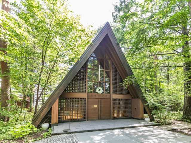 長年地元で愛される軽井沢のシンボル的存在。斬新な建物は著名な建築家、アントニン・レーモンドの設計によるもの。