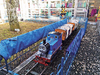 「フラワーキッズ ファクトリー」の中庭には、実際に乗れる機関車トーマスが走っていてキッズに大人気(有料)。