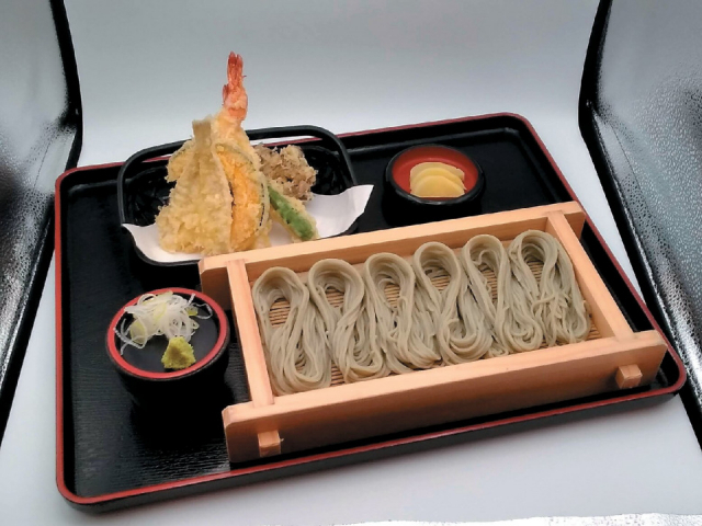 つなぎにふのりを使った小千谷そばと、揚げたて天ぷらがセットになったイチオシ!レストランで販売