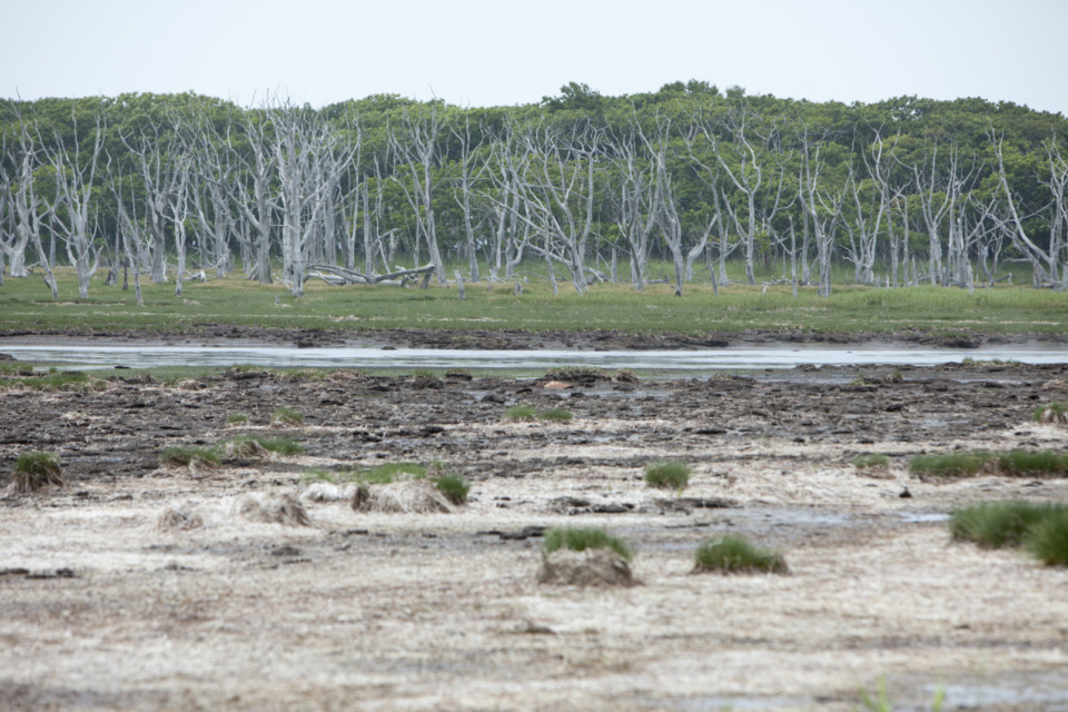 フラワーロードと呼ばれている野付半島の道路沿いに、海水で浸食されたミズナラ林「ナラワラ」もある