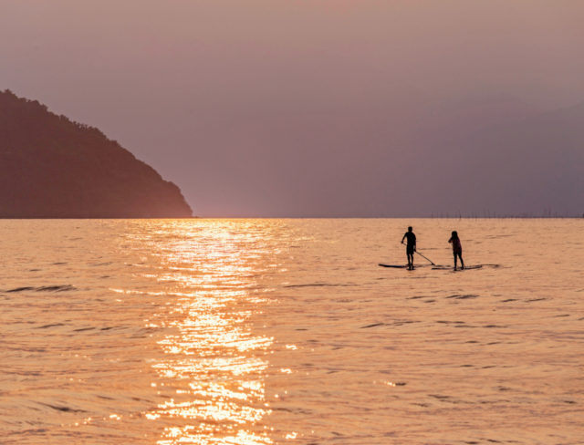 慣れてきたら自由に漕いでみよう。夕方には空と琵琶湖が夕陽に染まる景色を楽しめる