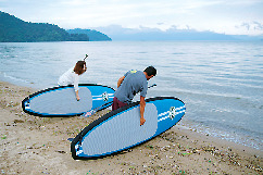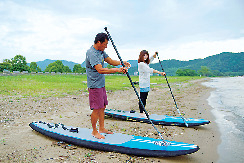 琵琶湖でSUPを始めた第一人者の白井さんが初心者から上級者までていねいにサポート。半日から挑戦できるスクールをはじめ、湖上から夕焼けを眺めるツアーなども開催する。道具のレンタル、ロッジでの宿泊やBBQもできる。