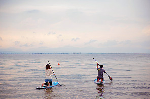 サーフボードに立ちパドルで漕いで進むハワイ発祥のウォータースポーツ。男女問わず幅広い世代に楽しまれている。