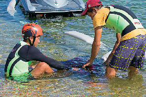 浅瀬に座って、水中で専用のブーツを装着。このブーツが水上バイクとつながっている