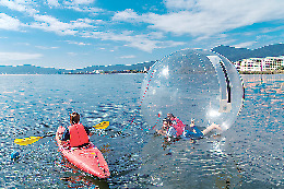 県内で唯一体験できるウォーターボールや、カヤック、SUPなど多彩なアクティビティが楽しめる。スタッフが撮影した体験中のデータをプレゼントしてくれるサービスも好評。