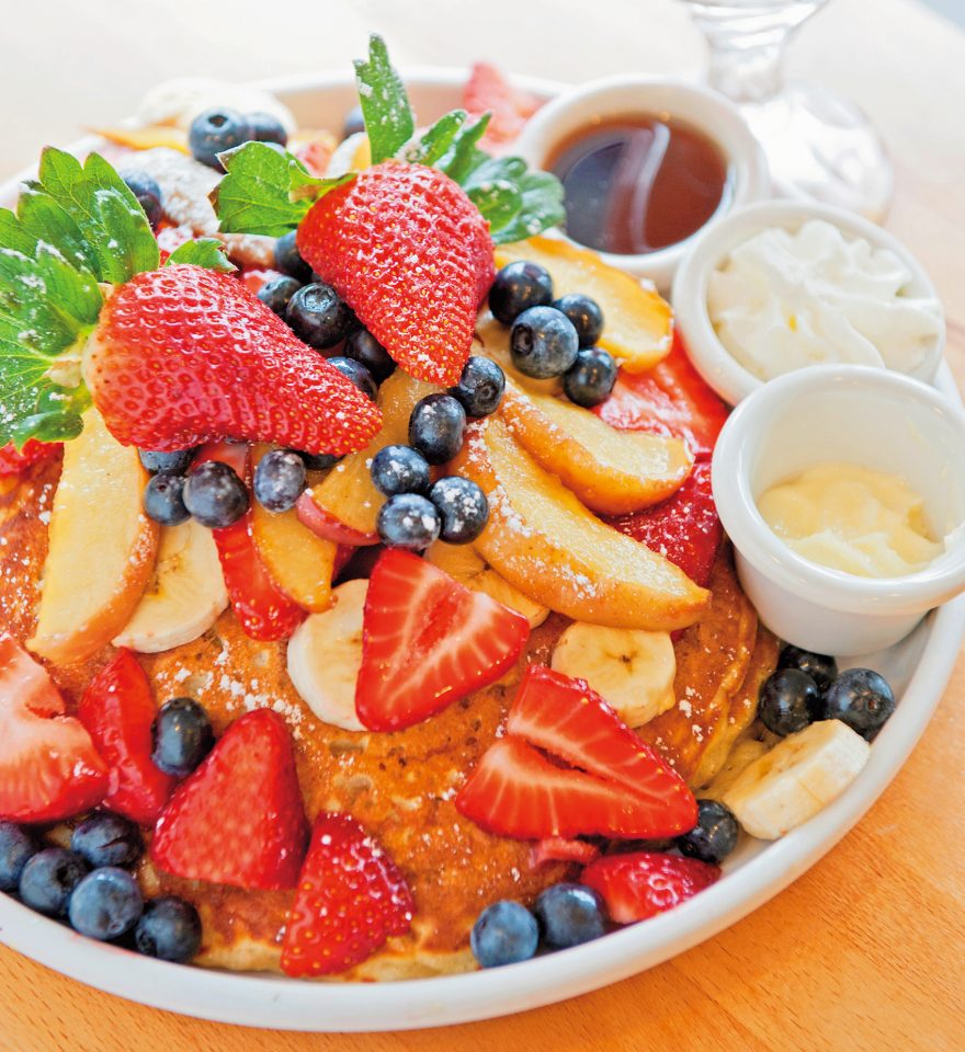 ビーガン向けのプレートや玄米おむすび、チアシード入りのスムージーなど、健康的なメニューを味わえるカフェ。パンケーキはどれもボリューム満点。