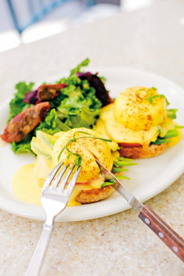 目の前に広がる海を眺めながら樹齢200余年の巨大なハウツリーの下で食事が楽しめる、最高のロケーション。人気はエッグベネディクトで、種類も豊富にそろう。