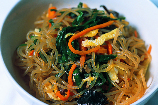 続いてご紹介する韓国の食べ物はチャプチェ。春雨と野菜を炒めた韓国料理です。韓国の春雨はサツマイモから作られているので、日本と比べてすこし太め。そのため春雨自体にもきちんと味が染みこみ美味しくいただけるのが特徴です。