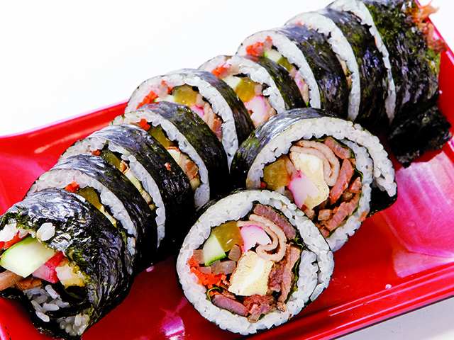 韓国の食べ物9品目は、韓国風の海苔巻き(太巻き)キンパです。お店によって異なりますが、ほうれん草、沢庵、牛肉などが入った食べ物で、キムチを入れるところもあります。見た目は海苔巻きとはいえ、日本のようにお醤油はつけません。具材にごま油の味がしっかりとついているのでそのまま美味しくいただきましょう。