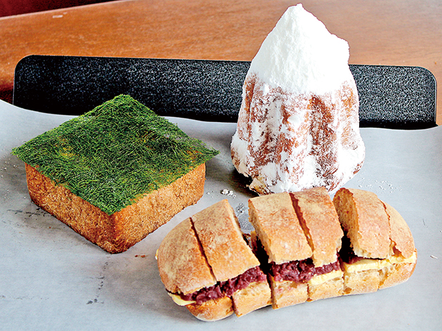 ジャンボンバターサンドイッチ8,500W(画像では左上のパン)。ハムとたっぷりのバターがクセになる人気メニューです。