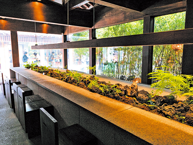 ガラス張りの店内のどこからでも日本風庭園を眺めながらくつろげるのが清水堂 本店。注文後に焼き上げるスフレケーキや、京都のプレミアム抹茶を使用した抹茶ラテがシグネチャーメニューです。