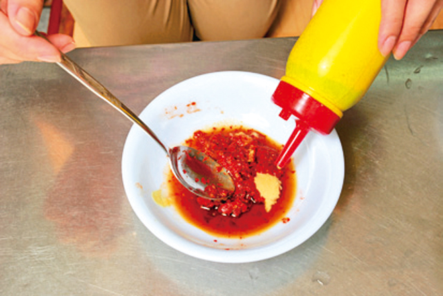 具材を煮る間、トウガラシペーストや酢などを混ぜてタレ作り。味見しながら調整を。