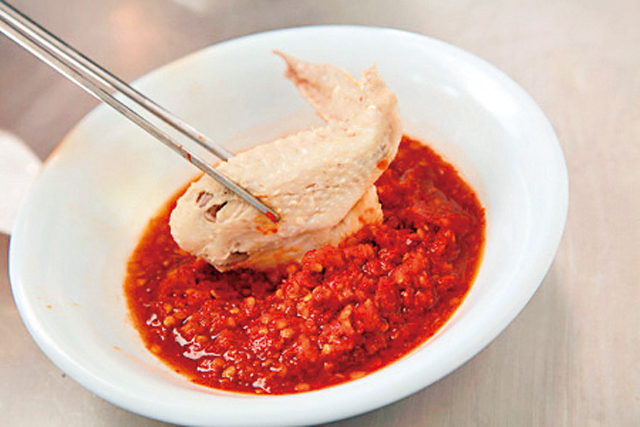 作ったタレに鶏肉をつけて食べる。食べながら辛さを調節し、味の変化を楽しもう。