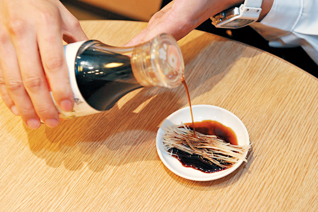 ①はじめに、しょうがを入れた小皿に酢と醤油を3:1の割合で入れ、タレを作る。
