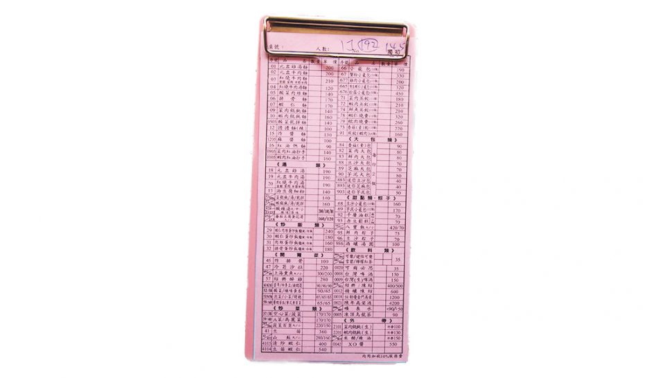 注文は写真のようなメニュー名と値段が書いてある伝票に客が直接書き込むことが多い。伝票と一緒に写真付のメニューを渡されることも。