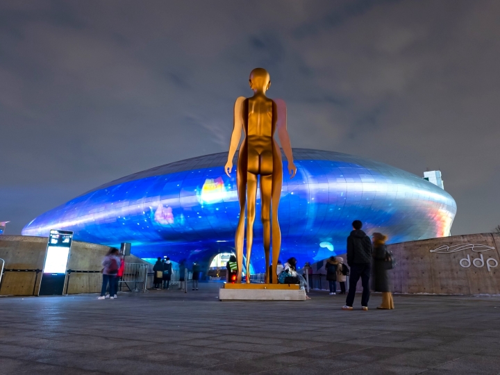 3次元の立体設計技法を駆使して設計され、曲線的で独特なフォルムの建築デザインは東大門でも圧倒的な存在感を放ちます。