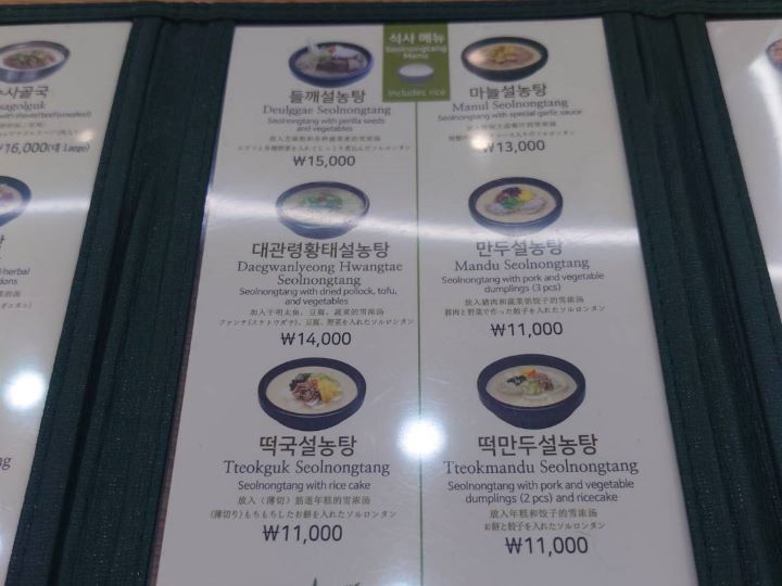 神仙ソルロンタンには観光客が多く訪れるので、メニュー表には韓国語だけでなく英語・中国語・日本語でも書かれています。韓国語が分からないという方でも安心ですね。