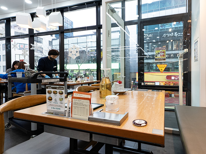 外観同様、店内もとても清潔感がありきれいでした。テーブルの横にはキムチが置いてあり、自由に好きなだけとって食べることができます。