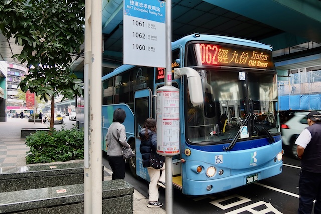 MRT府中駅から出ている965番バスか、MRT忠孝復興駅から出ている1062番バスに乗り、乗り換えなしで九份まで行く方法。どちらのバスも台北の中心部にバス停があるのでとても便利です。