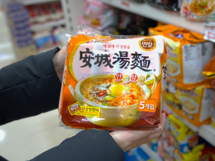 真っ赤なスープが印象的な農心の安城湯麺は、牛骨と牛肉を煮込んだスープで旨味たっぷり。