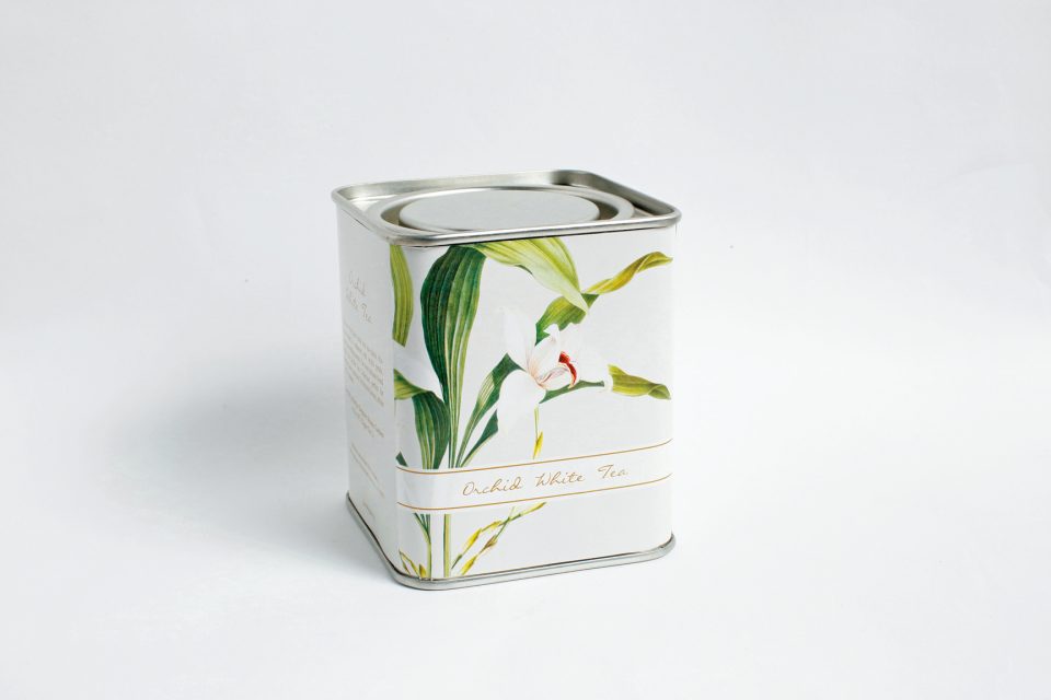 缶に植物が描かれたオーキッド・ホワイト・ティーS$28