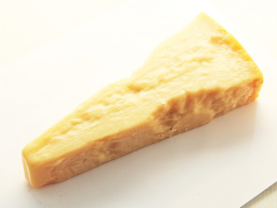 パルメザンチーズ。牛乳製のコクのある風味で「チーズの王様」とも。そのまま、あるいはすりおろして使用します。