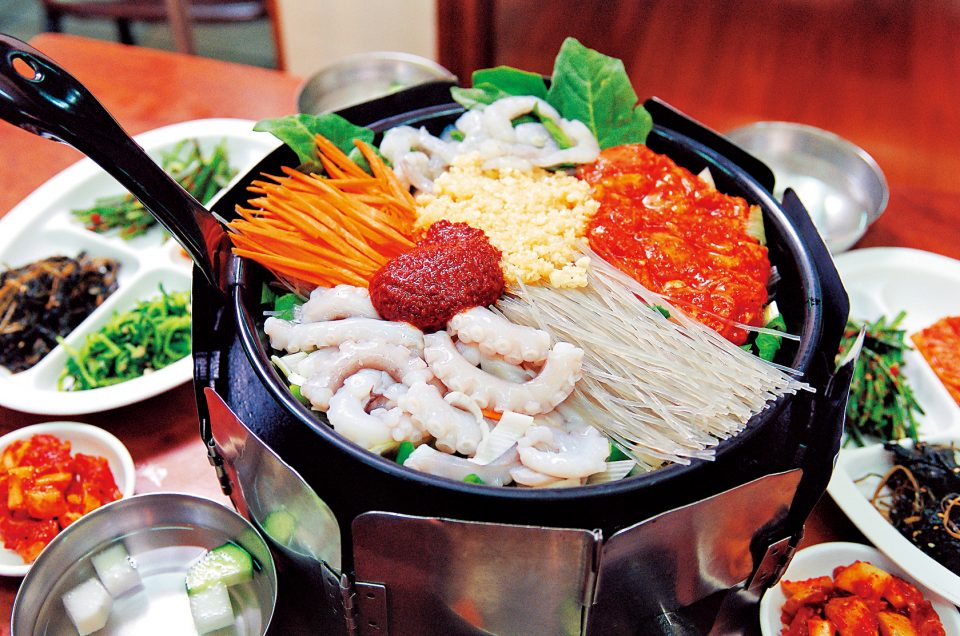 ナッチはテナガダコのこと。ニンニクとコチュジャンで味付けしたナッチや野菜を、スープ入りの鍋でいただくのがプサン流。締めはポックンパッ(炒飯)が◎。