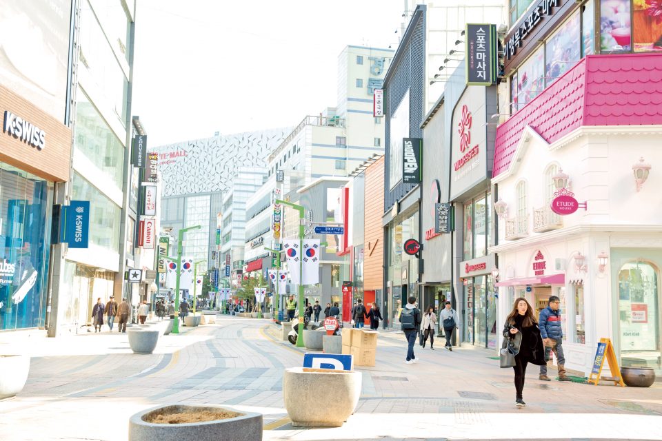 南浦洞のメイン通り、光復路にはコスメ店がずらり! 周辺にはグルメ店もたくさんある。