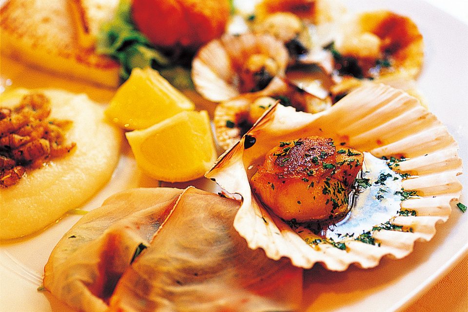 ホタテ貝のヴェネツィア風焼き。にんにく、オリーブオイル、レモンの風味が◎