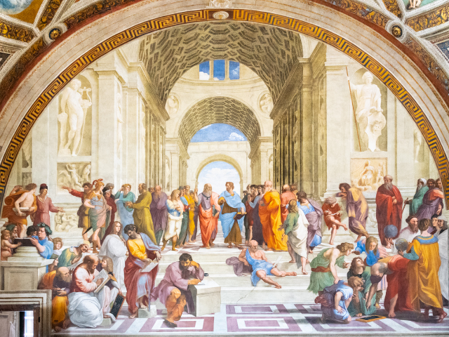 ラファエロは「アテネの学堂」に、その時代に活躍した画家や作家などを登場させており、ラファエロ自身やラファエロの恋人であった女性、マルゲリータも描かれているといわれています。