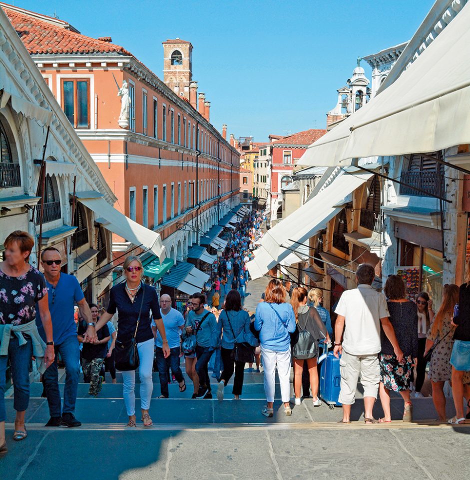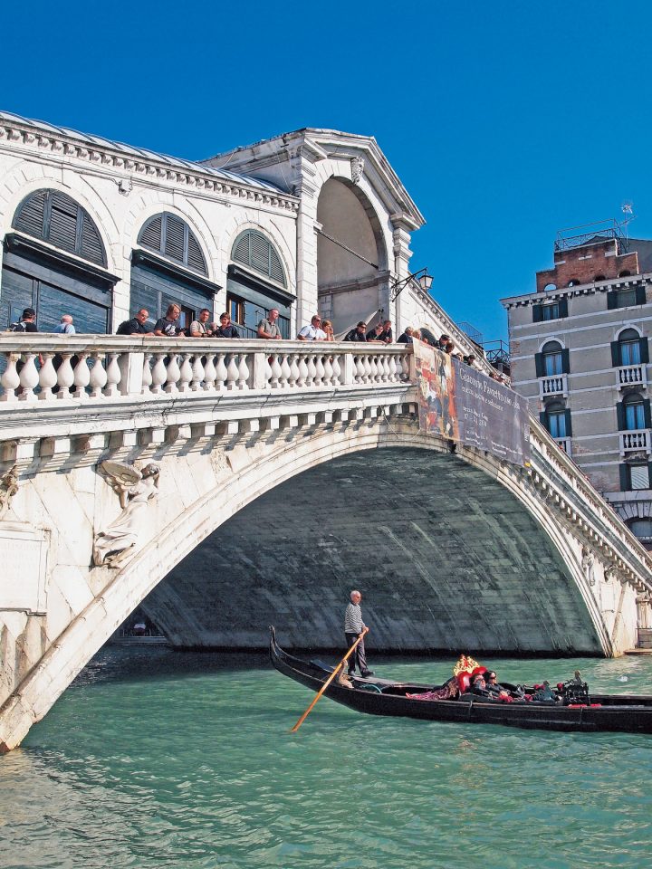大運河に架かる白大理石が美しい橋。サン・マルコ広場からここに来るまでのメルチェリエ通りはみやげ物店がずらりと並んでいて、見るだけでも楽しめるエリアです。