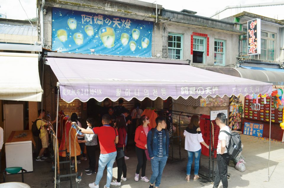 1980年創業の、十分で最初の天燈店。日本語世代の牡丹おばあちゃん(=阿媽)が、今も現役で天燈やおみやげを手作り、販売している。日本円での支払いも可能で、多くの観光客でにぎわう。