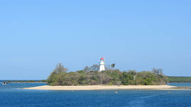 白い砂浜に囲まれて、ヤシの木が生い茂っている島の真ん中には、白い壁に赤い屋根の付いた灯台がある、絵に描いたような、とてもかわいらしい島です。