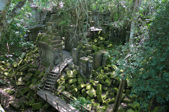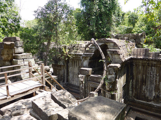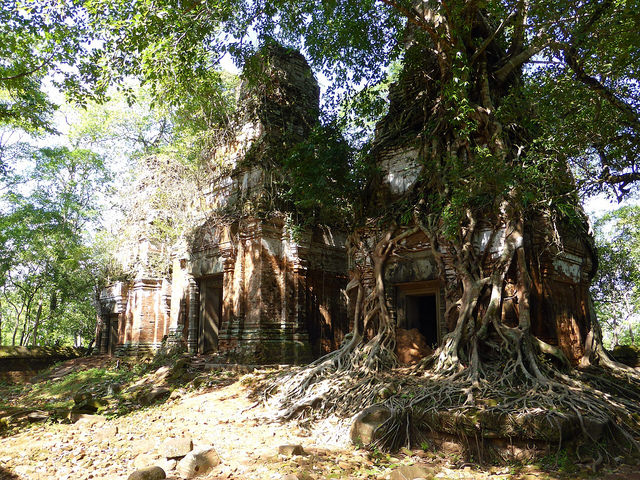 アンコールワットから40kmも東にありますがアンコール王朝の遺跡群の一つで、崩壊が激しく探索できるエリアが限られます。大きな修復もなく風雨に晒されるままになっているのが却って人気で、木や蔦が絡まっていて幻想的な雰囲気を味わえます。