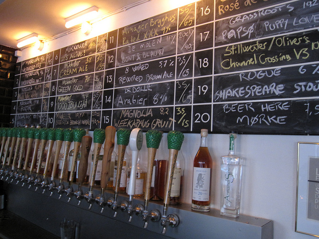コペンハーゲン中央駅から徒歩10分ほどの距離にある Mikkeller Bar では常時20種類のオリジナルビールを提供しています。デンマークのビールは基本的にはホップが香る、すっきりとした味わいのビールが多いですが、こちらではもっと個性的な、例えばスパイスや果物の風味が感じられるもの、無ろ過で味に深みがあるもの、はたまたショットグラスで提供されるものなど様々。
