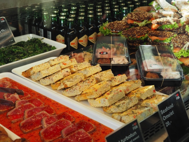マーケット内ではそれらの新鮮なシーフードを使用したデリがたくさん売られています。