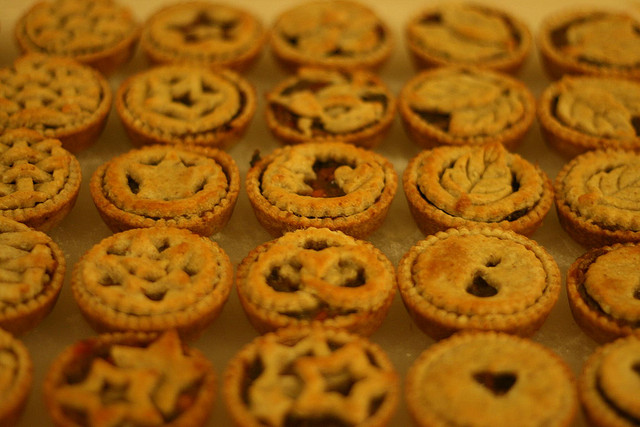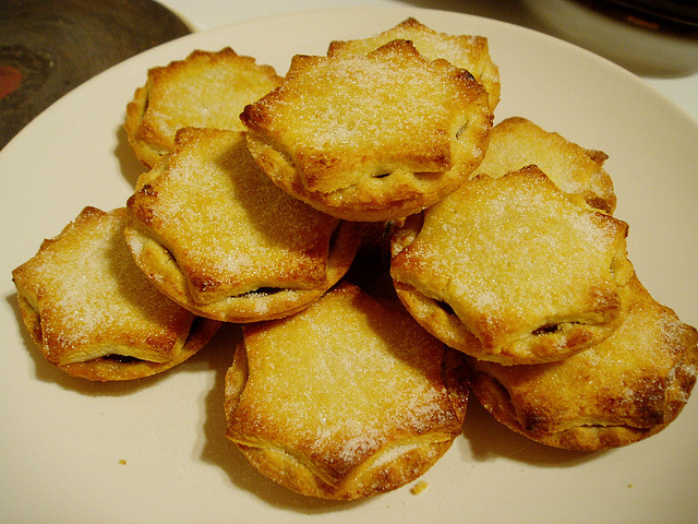 昔はその具に挽き肉を使っていたことから、ミンスミートと呼ばれるようになったとか。クリスマスからの十二夜(一月六日まで)の間にミンスパイを一日一個ずつ食べると幸せが訪れる、という言い伝えがありますが、イギリス人は待ちきれないようで12月になると至る所でミンスパイを食べています。