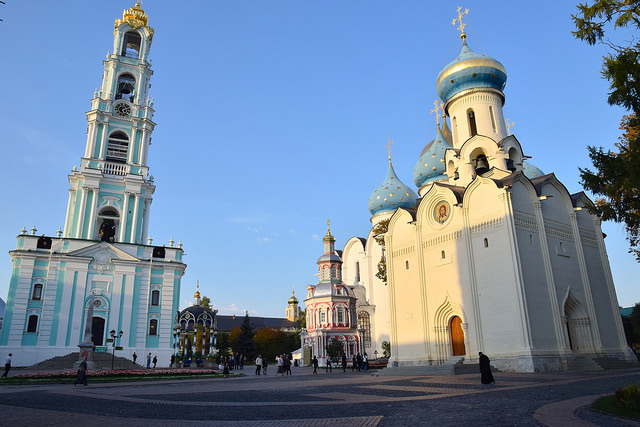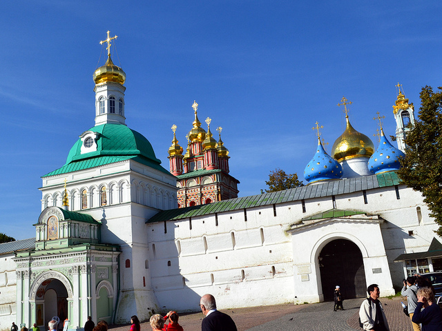 ロシアの首都、モスクワから北へ約90km行ったセルギエス・ポサードという町にあるロシア正教会最大の修道院です。ロシアで最も尊敬されるラドネジの聖セルギイにより1345年に至聖三者大聖堂が創設されたのが起源です。